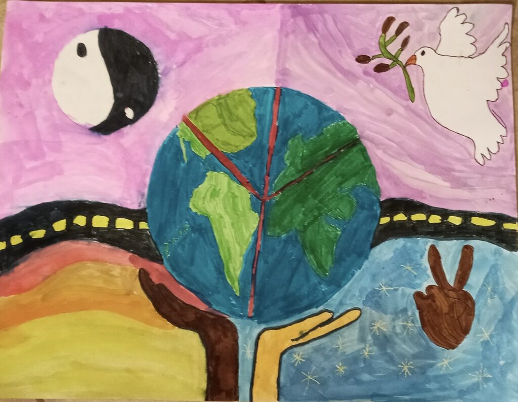 “Peace Without Limits” was the theme of the 2024-25 Lions International Peace Poster Contest. Fraser Valley Elementary students, aged 11-12, stepped up to the expression in their art.  Thanks to art teacher, Shelley Peeters, we received many beautiful entries.  First place winner ($100) was Finn Kamin; 2nd place ($50) was Vila Hershfelt; 3rd place ($25) was Collins Jarzynka.